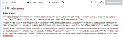 Si haces click en "Editar" se abre la página como un documento que se puede editar directamente usando el menu de edición. En este formato ves los cambios que haces tal y cual como van a aparecer en la página. Cuando terminas con los cambios que quieres hacer haces click en "Guardar Cambios" y se guarda lo que hiciste.