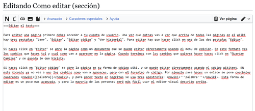 Para editar una página, primero debes acceder a tu cuenta de usuario, usando tu nombre de usuario y tu password. Una vez que entras vas a ver que arriba de todas las páginas en el wiiki hay tres pestañas: "Leer", "Editar", "Editar código" y "Ver historial". Para editar hay que hacer click en una de las dos pestañas "Editar".